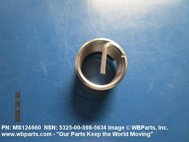 5325-00-598-5634 A cylindrical item which may have wrenching and/or driving facilities and/or shoulders. It is designed to be inserted in a drilled, tapped or a pretapped hole, or molded or pressed into soft material to reduce the size of a tapped hole; to provide threads; to add strength, and/or to prevent stripping. It is one of the following: (1) a one-piece, flanged or unflanged, internally threaded item which may have external threads, and/or serrations around the periphery of the collar, designed to engage a serrated lock ring which is not included with the item; (2) a one-piece precision coiled wire; (3) a two-piece item consisting of an internally threaded cylinder and a mating externally threaded part; or (4) a one-piece internally threaded item whose outside diameter is tapered and/or knurled and/or with fin(s). The internal thread of the item may have a locking feature. Excludes items having a sleeve on on its under portion which can be clinched or crimped. Excludes BUSHING,MACHINE THREAD; NUT,PLAIN,KNURLED; NUT,PLAIN,ROUND; NUT,PLAIN,CLINCH and NUT,SELF-LOCKING,CLINCH. See also NUT,PLAIN,PLATE