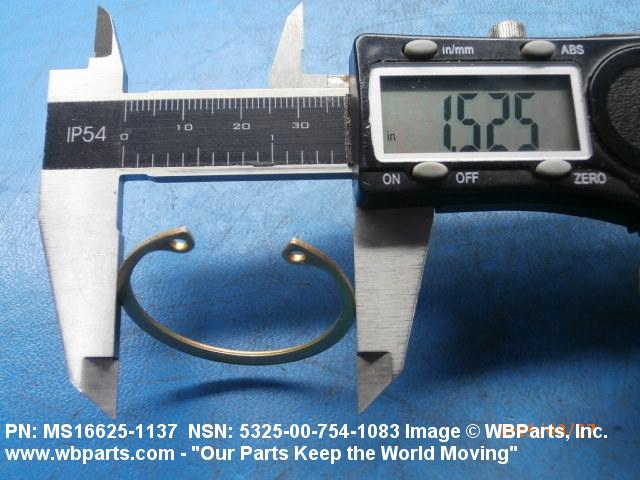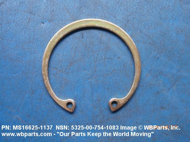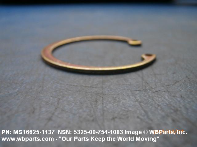 5325-00-754-1083 A resilient metal item, circular or nearly circular, which is designed to be inserted into an internal or external groove and retained by its own spring action, or it may have external prongs or projections designed to be inserted into a hole and retained by spring action of the prongs which grip by imbedding into the material. For items having internal prongs which perform the same function, see PUSH ON NUT. It is used to keep and/or lock a part(s) in position, as a ball bearing on a shaft or in a housing. See also CLIP, RETAINING and PIN, LOCK. Excludes RING, CONNECTING, ROUND.