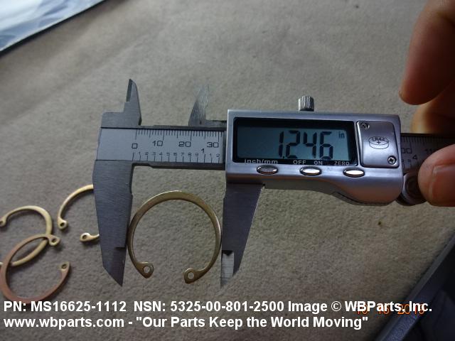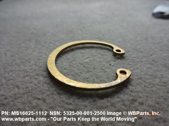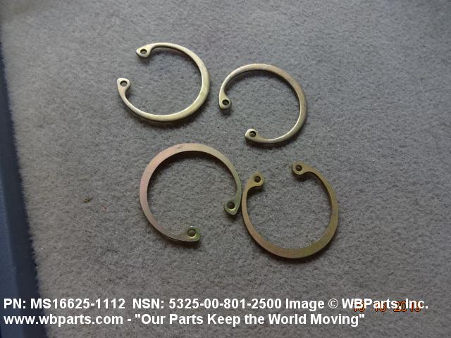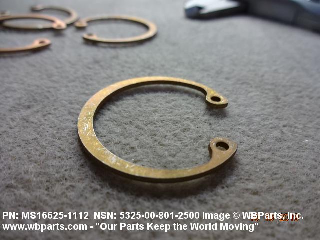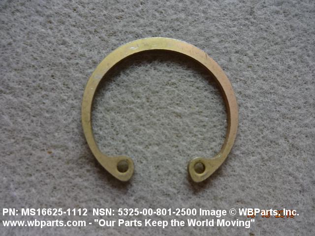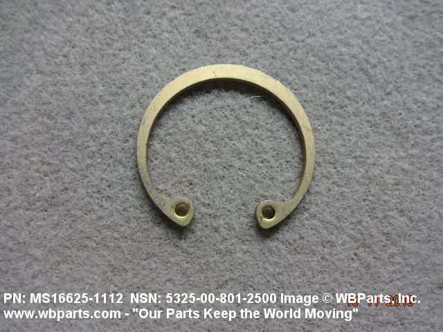 5325-00-801-2500 A resilient metal item, circular or nearly circular, which is designed to be inserted into an internal or external groove and retained by its own spring action, or it may have external prongs or projections designed to be inserted into a hole and retained by spring action of the prongs which grip by imbedding into the material. For items having internal prongs which perform the same function, see PUSH ON NUT. It is used to keep and/or lock a part(s) in position, as a ball bearing on a shaft or in a housing. See also CLIP, RETAINING and PIN, LOCK. Excludes RING, CONNECTING, ROUND.