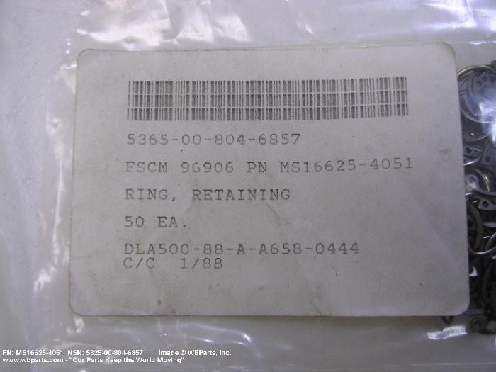 Part Alternates: MS166254051, MS16625-4051, N130051AS, N1300-51AS, N500051H, N5000-51H, N5000X51H, N5000-X51-H, 500051W, 5000-51W, 5325-00-804-6857, 00-804-6857, 5325008046857, 008046857