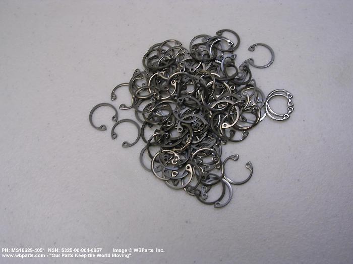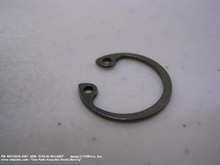 5325-00-804-6857 A resilient metal item, circular or nearly circular, which is designed to be inserted into an internal or external groove and retained by its own spring action, or it may have external prongs or projections designed to be inserted into a hole and retained by spring action of the prongs which grip by imbedding into the material. For items having internal prongs which perform the same function, see PUSH ON NUT. It is used to keep and/or lock a part(s) in position, as a ball bearing on a shaft or in a housing. See also CLIP, RETAINING and PIN, LOCK. Excludes RING, CONNECTING, ROUND.