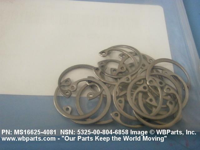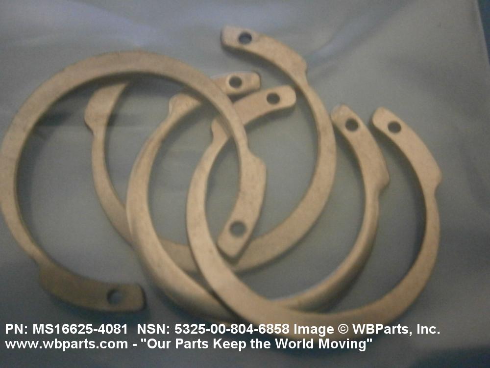 5325-00-804-6858 A resilient metal item, circular or nearly circular, which is designed to be inserted into an internal or external groove and retained by its own spring action, or it may have external prongs or projections designed to be inserted into a hole and retained by spring action of the prongs which grip by imbedding into the material. For items having internal prongs which perform the same function, see PUSH ON NUT. It is used to keep and/or lock a part(s) in position, as a ball bearing on a shaft or in a housing. See also CLIP, RETAINING and PIN, LOCK. Excludes RING, CONNECTING, ROUND.