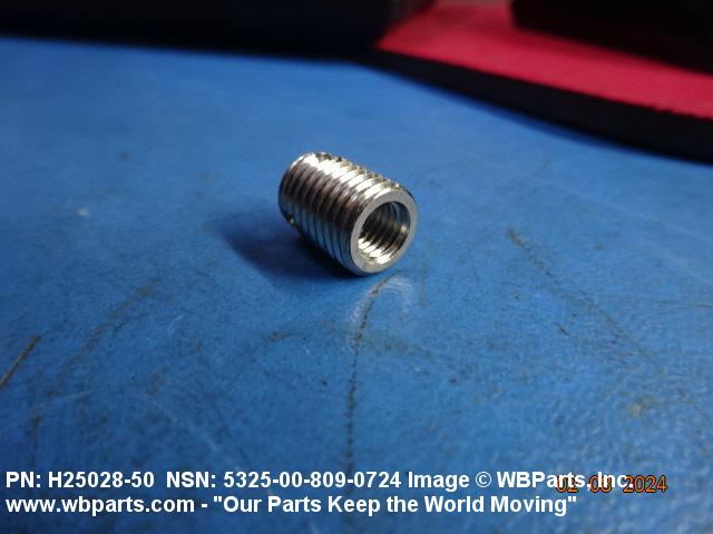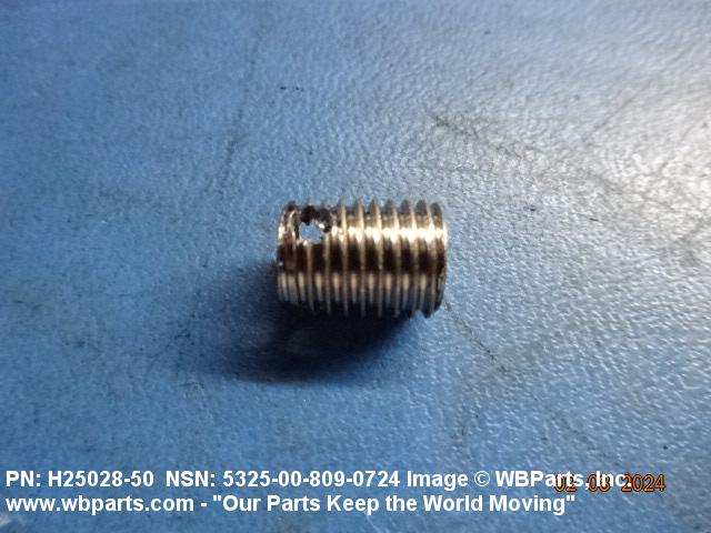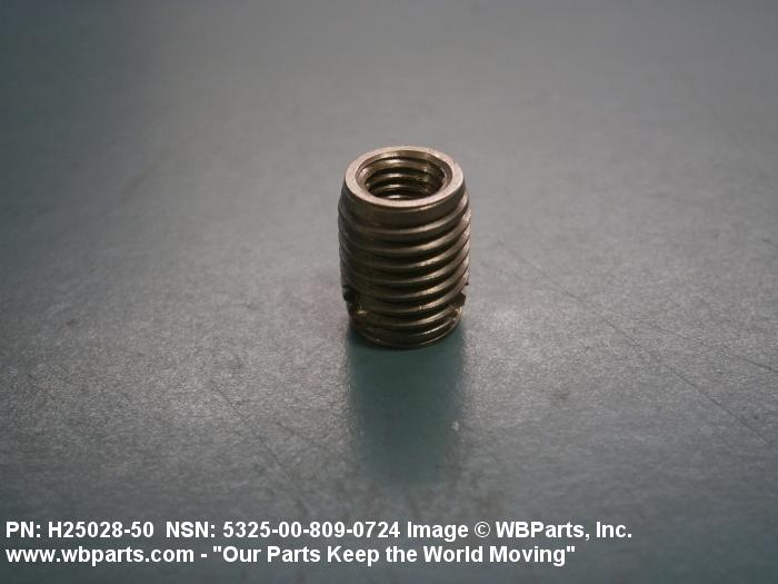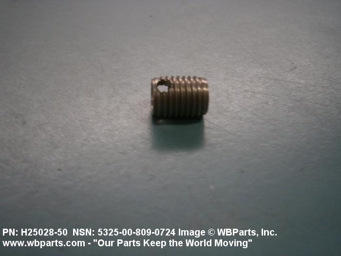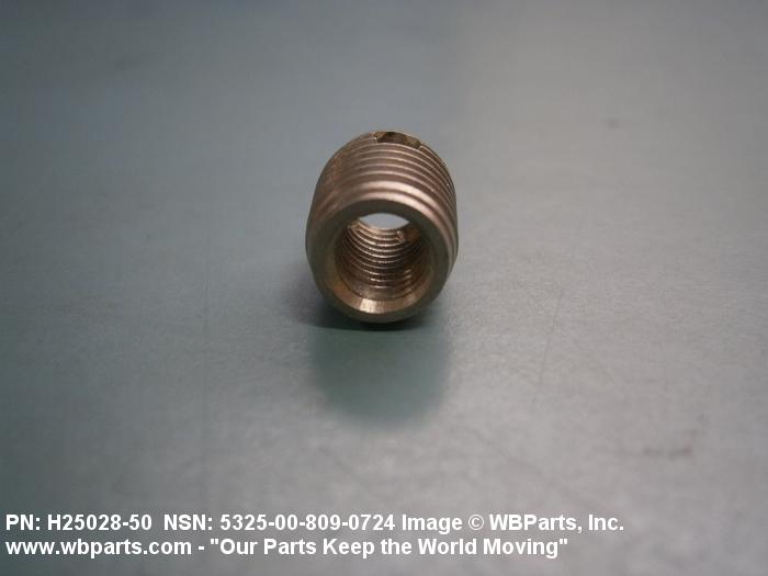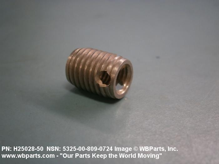5325-00-809-0724 A cylindrical item which may have wrenching and/or driving facilities and/or shoulders. It is designed to be inserted in a drilled, tapped or a pretapped hole, or molded or pressed into soft material to reduce the size of a tapped hole; to provide threads; to add strength, and/or to prevent stripping. It is one of the following: (1) a one-piece, flanged or unflanged, internally threaded item which may have external threads, and/or serrations around the periphery of the collar, designed to engage a serrated lock ring which is not included with the item; (2) a one-piece precision coiled wire; (3) a two-piece item consisting of an internally threaded cylinder and a mating externally threaded part; or (4) a one-piece internally threaded item whose outside diameter is tapered and/or knurled and/or with fin(s). The internal thread of the item may have a locking feature. Excludes items having a sleeve on on its under portion which can be clinched or crimped. Excludes BUSHING,MACHINE THREAD; NUT,PLAIN,KNURLED; NUT,PLAIN,ROUND; NUT,PLAIN,CLINCH and NUT,SELF-LOCKING,CLINCH. See also NUT,PLAIN,PLATE