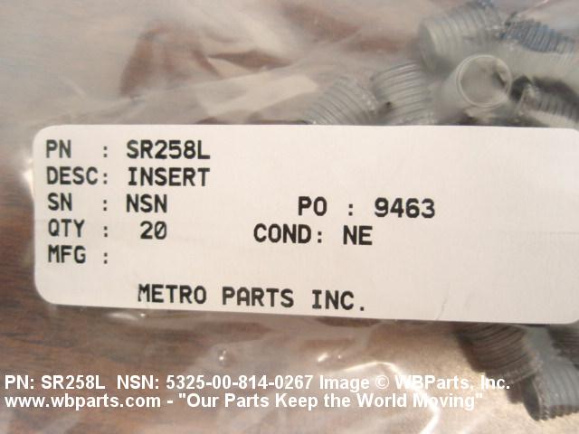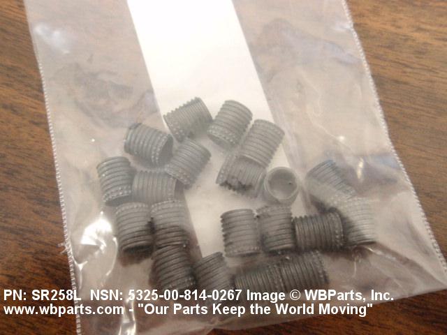 5325-00-814-0267 A cylindrical item which may have wrenching and/or driving facilities and/or shoulders. It is designed to be inserted in a drilled, tapped or a pretapped hole, or molded or pressed into soft material to reduce the size of a tapped hole; to provide threads; to add strength, and/or to prevent stripping. It is one of the following: (1) a one-piece, flanged or unflanged, internally threaded item which may have external threads, and/or serrations around the periphery of the collar, designed to engage a serrated lock ring which is not included with the item; (2) a one-piece precision coiled wire; (3) a two-piece item consisting of an internally threaded cylinder and a mating externally threaded part; or (4) a one-piece internally threaded item whose outside diameter is tapered and/or knurled and/or with fin(s). The internal thread of the item may have a locking feature. Excludes items having a sleeve on on its under portion which can be clinched or crimped. Excludes BUSHING,MACHINE THREAD; NUT,PLAIN,KNURLED; NUT,PLAIN,ROUND; NUT,PLAIN,CLINCH and NUT,SELF-LOCKING,CLINCH. See also NUT,PLAIN,PLATE