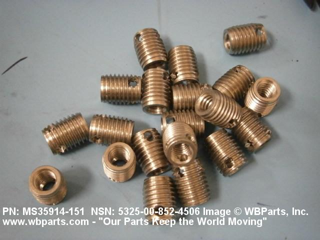 5325-00-852-4506 A cylindrical item which may have wrenching and/or driving facilities and/or shoulders. It is designed to be inserted in a drilled, tapped or a pretapped hole, or molded or pressed into soft material to reduce the size of a tapped hole; to provide threads; to add strength, and/or to prevent stripping. It is one of the following: (1) a one-piece, flanged or unflanged, internally threaded item which may have external threads, and/or serrations around the periphery of the collar, designed to engage a serrated lock ring which is not included with the item; (2) a one-piece precision coiled wire; (3) a two-piece item consisting of an internally threaded cylinder and a mating externally threaded part; or (4) a one-piece internally threaded item whose outside diameter is tapered and/or knurled and/or with fin(s). The internal thread of the item may have a locking feature. Excludes items having a sleeve on on its under portion which can be clinched or crimped. Excludes BUSHING,MACHINE THREAD; NUT,PLAIN,KNURLED; NUT,PLAIN,ROUND; NUT,PLAIN,CLINCH and NUT,SELF-LOCKING,CLINCH. See also NUT,PLAIN,PLATE