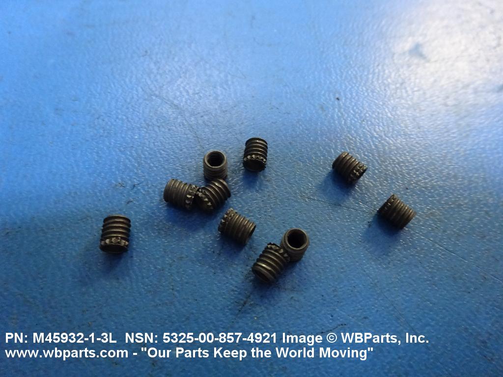 5325-00-857-4921 A cylindrical item which may have wrenching and/or driving facilities and/or shoulders. It is designed to be inserted in a drilled, tapped or a pretapped hole, or molded or pressed into soft material to reduce the size of a tapped hole; to provide threads; to add strength, and/or to prevent stripping. It is one of the following: (1) a one-piece, flanged or unflanged, internally threaded item which may have external threads, and/or serrations around the periphery of the collar, designed to engage a serrated lock ring which is not included with the item; (2) a one-piece precision coiled wire; (3) a two-piece item consisting of an internally threaded cylinder and a mating externally threaded part; or (4) a one-piece internally threaded item whose outside diameter is tapered and/or knurled and/or with fin(s). The internal thread of the item may have a locking feature. Excludes items having a sleeve on on its under portion which can be clinched or crimped. Excludes BUSHING,MACHINE THREAD; NUT,PLAIN,KNURLED; NUT,PLAIN,ROUND; NUT,PLAIN,CLINCH and NUT,SELF-LOCKING,CLINCH. See also NUT,PLAIN,PLATE