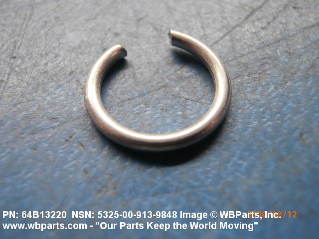 5325-00-913-9848 A resilient metal item, circular or nearly circular, which is designed to be inserted into an internal or external groove and retained by its own spring action, or it may have external prongs or projections designed to be inserted into a hole and retained by spring action of the prongs which grip by imbedding into the material. For items having internal prongs which perform the same function, see PUSH ON NUT. It is used to keep and/or lock a part(s) in position, as a ball bearing on a shaft or in a housing. See also CLIP, RETAINING and PIN, LOCK. Excludes RING, CONNECTING, ROUND.