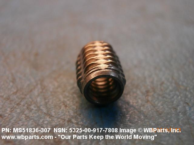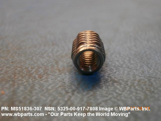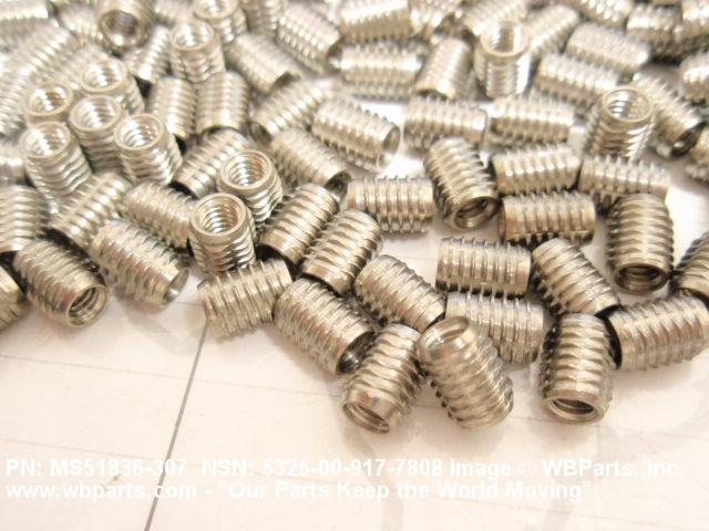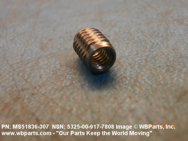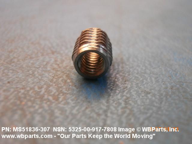 5325-00-917-7808 A cylindrical item which may have wrenching and/or driving facilities and/or shoulders. It is designed to be inserted in a drilled, tapped or a pretapped hole, or molded or pressed into soft material to reduce the size of a tapped hole; to provide threads; to add strength, and/or to prevent stripping. It is one of the following: (1) a one-piece, flanged or unflanged, internally threaded item which may have external threads, and/or serrations around the periphery of the collar, designed to engage a serrated lock ring which is not included with the item; (2) a one-piece precision coiled wire; (3) a two-piece item consisting of an internally threaded cylinder and a mating externally threaded part; or (4) a one-piece internally threaded item whose outside diameter is tapered and/or knurled and/or with fin(s). The internal thread of the item may have a locking feature. Excludes items having a sleeve on on its under portion which can be clinched or crimped. Excludes BUSHING,MACHINE THREAD; NUT,PLAIN,KNURLED; NUT,PLAIN,ROUND; NUT,PLAIN,CLINCH and NUT,SELF-LOCKING,CLINCH. See also NUT,PLAIN,PLATE