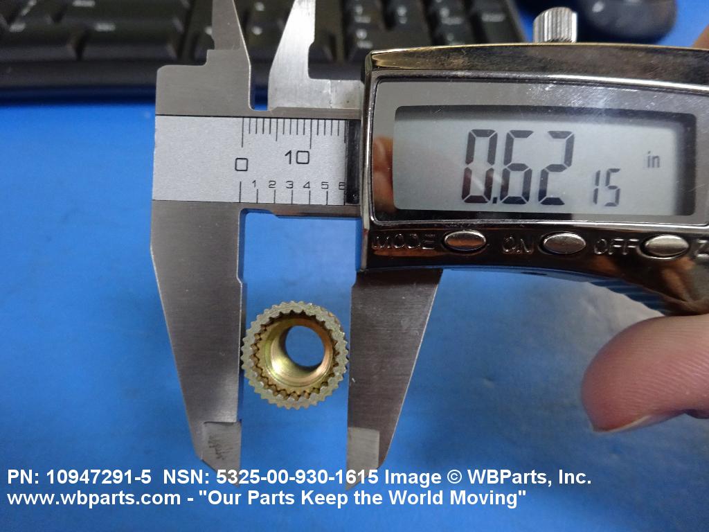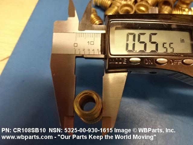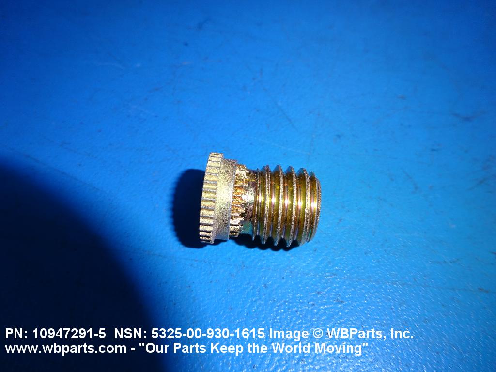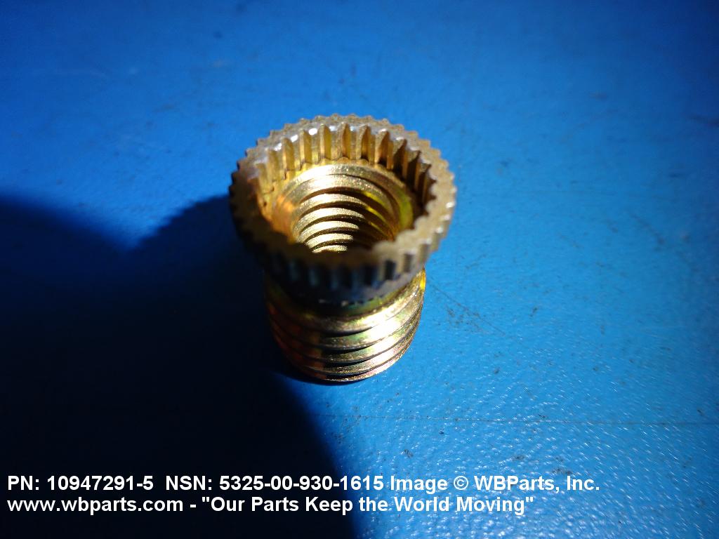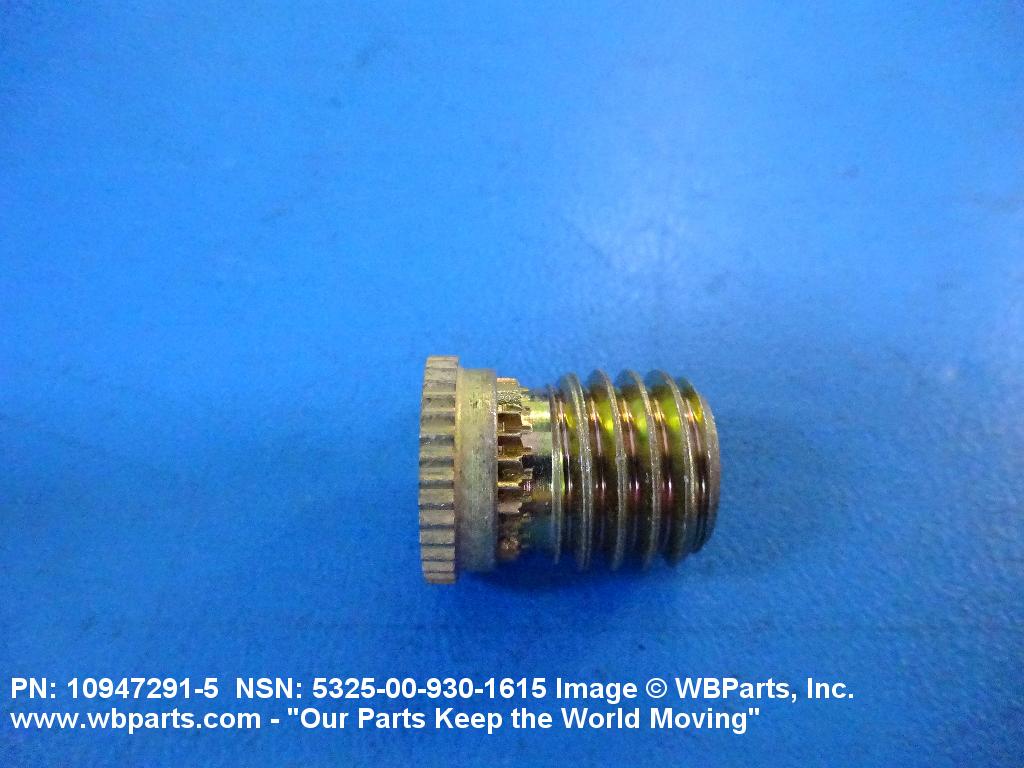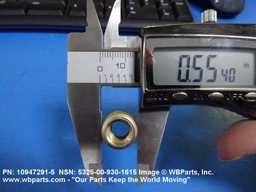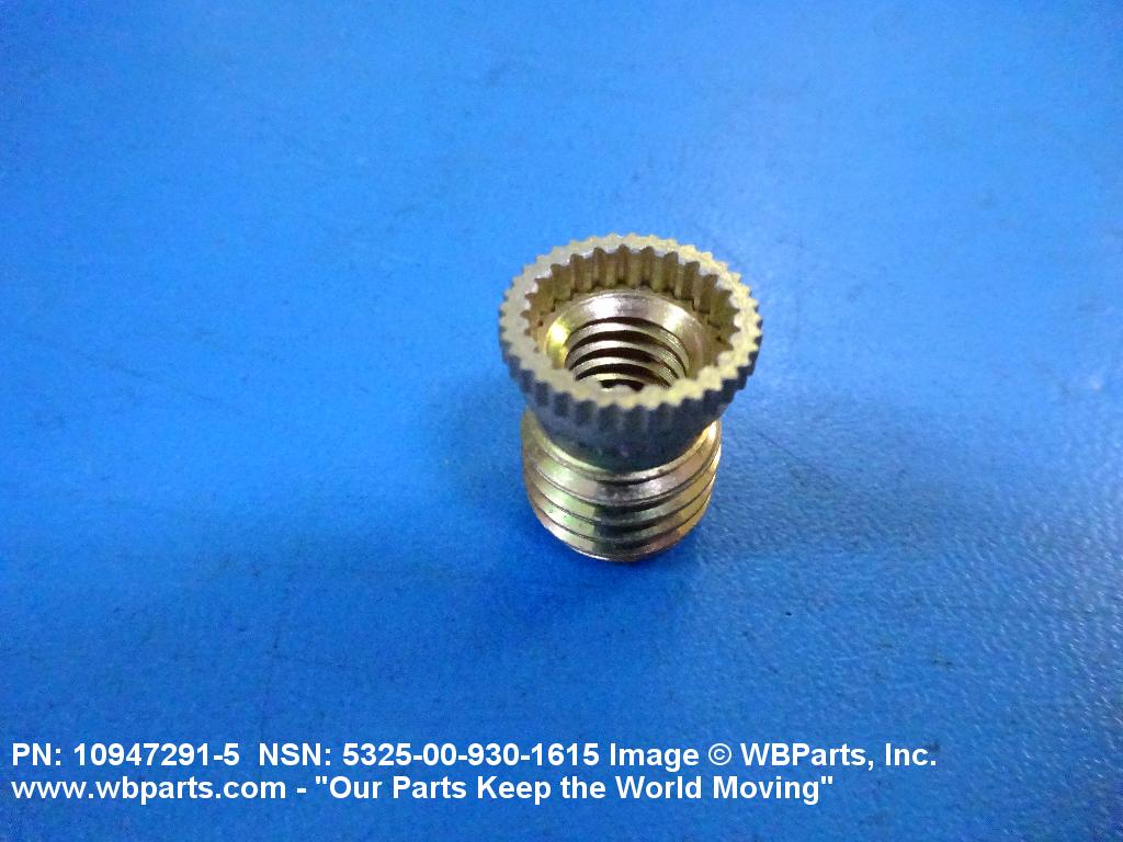 5325-00-930-1615 A cylindrical item which may have wrenching and/or driving facilities and/or shoulders. It is designed to be inserted in a drilled, tapped or a pretapped hole, or molded or pressed into soft material to reduce the size of a tapped hole; to provide threads; to add strength, and/or to prevent stripping. It is one of the following: (1) a one-piece, flanged or unflanged, internally threaded item which may have external threads, and/or serrations around the periphery of the collar, designed to engage a serrated lock ring which is not included with the item; (2) a one-piece precision coiled wire; (3) a two-piece item consisting of an internally threaded cylinder and a mating externally threaded part; or (4) a one-piece internally threaded item whose outside diameter is tapered and/or knurled and/or with fin(s). The internal thread of the item may have a locking feature. Excludes items having a sleeve on on its under portion which can be clinched or crimped. Excludes BUSHING,MACHINE THREAD; NUT,PLAIN,KNURLED; NUT,PLAIN,ROUND; NUT,PLAIN,CLINCH and NUT,SELF-LOCKING,CLINCH. See also NUT,PLAIN,PLATE