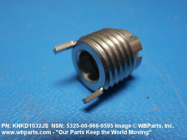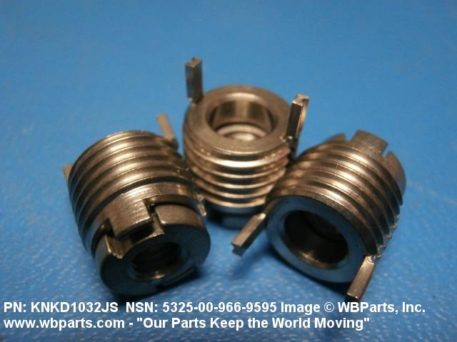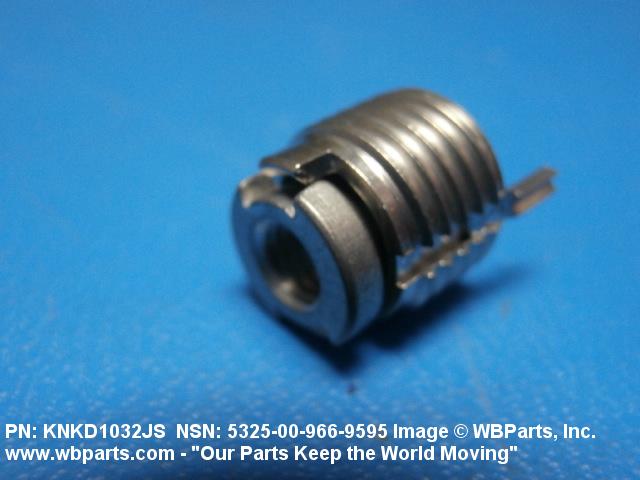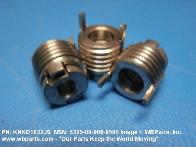 5325-00-966-9595 A cylindrical item which may have wrenching and/or driving facilities and/or shoulders. It is designed to be inserted in a drilled, tapped or a pretapped hole, or molded or pressed into soft material to reduce the size of a tapped hole; to provide threads; to add strength, and/or to prevent stripping. It is one of the following: (1) a one-piece, flanged or unflanged, internally threaded item which may have external threads, and/or serrations around the periphery of the collar, designed to engage a serrated lock ring which is not included with the item; (2) a one-piece precision coiled wire; (3) a two-piece item consisting of an internally threaded cylinder and a mating externally threaded part; or (4) a one-piece internally threaded item whose outside diameter is tapered and/or knurled and/or with fin(s). The internal thread of the item may have a locking feature. Excludes items having a sleeve on on its under portion which can be clinched or crimped. Excludes BUSHING,MACHINE THREAD; NUT,PLAIN,KNURLED; NUT,PLAIN,ROUND; NUT,PLAIN,CLINCH and NUT,SELF-LOCKING,CLINCH. See also NUT,PLAIN,PLATE