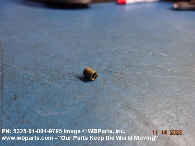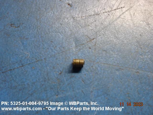 5325-01-004-9795 A cylindrical item which may have wrenching and/or driving facilities and/or shoulders. It is designed to be inserted in a drilled, tapped or a pretapped hole, or molded or pressed into soft material to reduce the size of a tapped hole; to provide threads; to add strength, and/or to prevent stripping. It is one of the following: (1) a one-piece, flanged or unflanged, internally threaded item which may have external threads, and/or serrations around the periphery of the collar, designed to engage a serrated lock ring which is not included with the item; (2) a one-piece precision coiled wire; (3) a two-piece item consisting of an internally threaded cylinder and a mating externally threaded part; or (4) a one-piece internally threaded item whose outside diameter is tapered and/or knurled and/or with fin(s). The internal thread of the item may have a locking feature. Excludes items having a sleeve on on its under portion which can be clinched or crimped. Excludes BUSHING,MACHINE THREAD; NUT,PLAIN,KNURLED; NUT,PLAIN,ROUND; NUT,PLAIN,CLINCH and NUT,SELF-LOCKING,CLINCH. See also NUT,PLAIN,PLATE