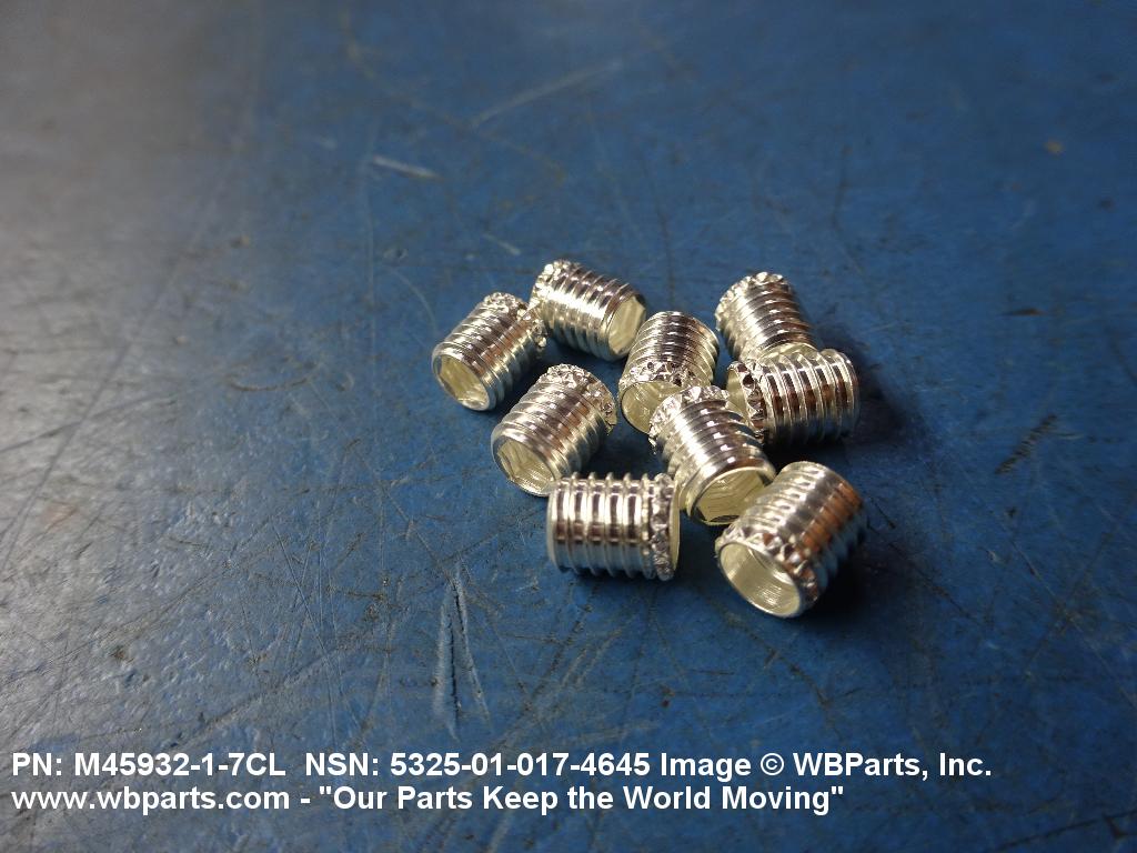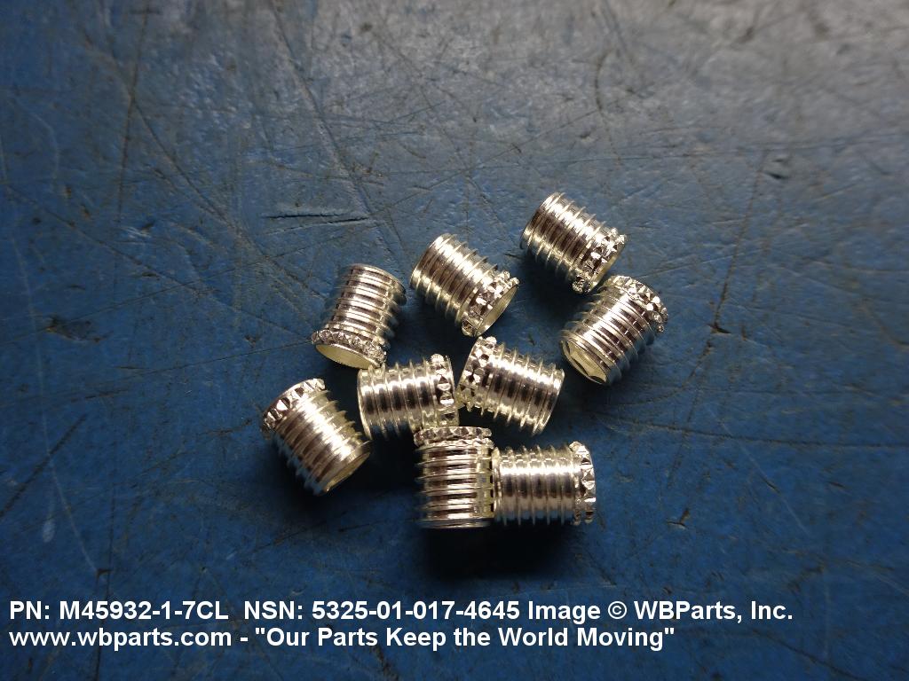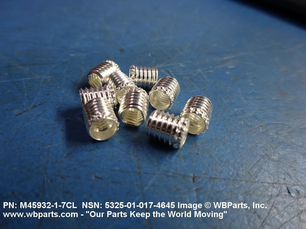 5325-01-017-4645 A cylindrical item which may have wrenching and/or driving facilities and/or shoulders. It is designed to be inserted in a drilled, tapped or a pretapped hole, or molded or pressed into soft material to reduce the size of a tapped hole; to provide threads; to add strength, and/or to prevent stripping. It is one of the following: (1) a one-piece, flanged or unflanged, internally threaded item which may have external threads, and/or serrations around the periphery of the collar, designed to engage a serrated lock ring which is not included with the item; (2) a one-piece precision coiled wire; (3) a two-piece item consisting of an internally threaded cylinder and a mating externally threaded part; or (4) a one-piece internally threaded item whose outside diameter is tapered and/or knurled and/or with fin(s). The internal thread of the item may have a locking feature. Excludes items having a sleeve on on its under portion which can be clinched or crimped. Excludes BUSHING,MACHINE THREAD; NUT,PLAIN,KNURLED; NUT,PLAIN,ROUND; NUT,PLAIN,CLINCH and NUT,SELF-LOCKING,CLINCH. See also NUT,PLAIN,PLATE