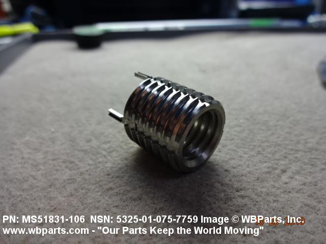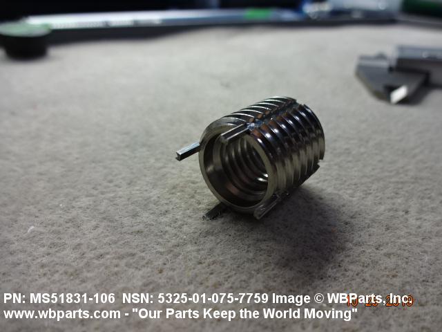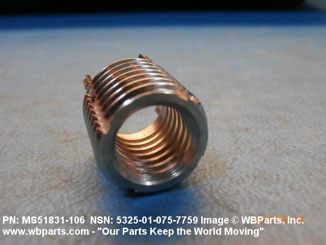 5325-01-075-7759 A cylindrical item which may have wrenching and/or driving facilities and/or shoulders. It is designed to be inserted in a drilled, tapped or a pretapped hole, or molded or pressed into soft material to reduce the size of a tapped hole; to provide threads; to add strength, and/or to prevent stripping. It is one of the following: (1) a one-piece, flanged or unflanged, internally threaded item which may have external threads, and/or serrations around the periphery of the collar, designed to engage a serrated lock ring which is not included with the item; (2) a one-piece precision coiled wire; (3) a two-piece item consisting of an internally threaded cylinder and a mating externally threaded part; or (4) a one-piece internally threaded item whose outside diameter is tapered and/or knurled and/or with fin(s). The internal thread of the item may have a locking feature. Excludes items having a sleeve on on its under portion which can be clinched or crimped. Excludes BUSHING,MACHINE THREAD; NUT,PLAIN,KNURLED; NUT,PLAIN,ROUND; NUT,PLAIN,CLINCH and NUT,SELF-LOCKING,CLINCH. See also NUT,PLAIN,PLATE