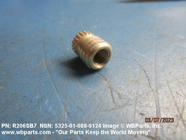 5325-01-088-9124 A cylindrical item which may have wrenching and/or driving facilities and/or shoulders. It is designed to be inserted in a drilled, tapped or a pretapped hole, or molded or pressed into soft material to reduce the size of a tapped hole; to provide threads; to add strength, and/or to prevent stripping. It is one of the following: (1) a one-piece, flanged or unflanged, internally threaded item which may have external threads, and/or serrations around the periphery of the collar, designed to engage a serrated lock ring which is not included with the item; (2) a one-piece precision coiled wire; (3) a two-piece item consisting of an internally threaded cylinder and a mating externally threaded part; or (4) a one-piece internally threaded item whose outside diameter is tapered and/or knurled and/or with fin(s). The internal thread of the item may have a locking feature. Excludes items having a sleeve on on its under portion which can be clinched or crimped. Excludes BUSHING,MACHINE THREAD; NUT,PLAIN,KNURLED; NUT,PLAIN,ROUND; NUT,PLAIN,CLINCH and NUT,SELF-LOCKING,CLINCH. See also NUT,PLAIN,PLATE