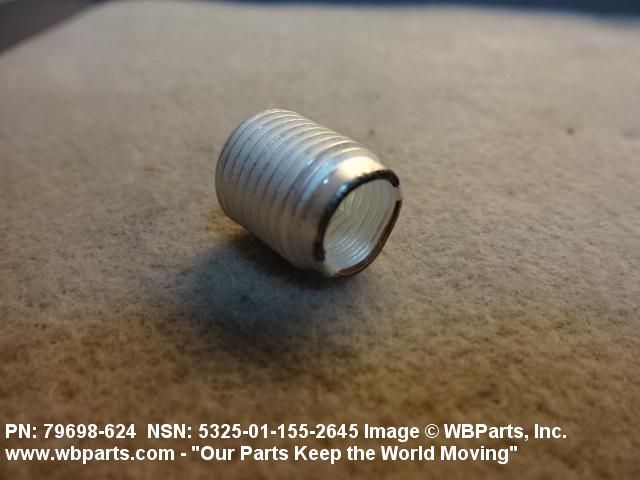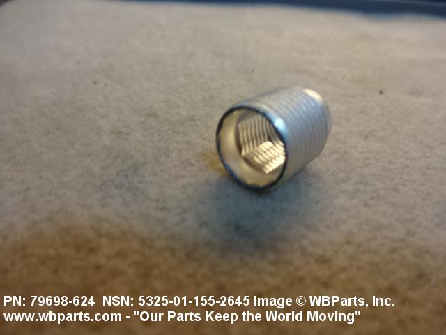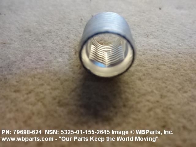 5325-01-155-2645 A cylindrical item which may have wrenching and/or driving facilities and/or shoulders. It is designed to be inserted in a drilled, tapped or a pretapped hole, or molded or pressed into soft material to reduce the size of a tapped hole; to provide threads; to add strength, and/or to prevent stripping. It is one of the following: (1) a one-piece, flanged or unflanged, internally threaded item which may have external threads, and/or serrations around the periphery of the collar, designed to engage a serrated lock ring which is not included with the item; (2) a one-piece precision coiled wire; (3) a two-piece item consisting of an internally threaded cylinder and a mating externally threaded part; or (4) a one-piece internally threaded item whose outside diameter is tapered and/or knurled and/or with fin(s). The internal thread of the item may have a locking feature. Excludes items having a sleeve on on its under portion which can be clinched or crimped. Excludes BUSHING,MACHINE THREAD; NUT,PLAIN,KNURLED; NUT,PLAIN,ROUND; NUT,PLAIN,CLINCH and NUT,SELF-LOCKING,CLINCH. See also NUT,PLAIN,PLATE