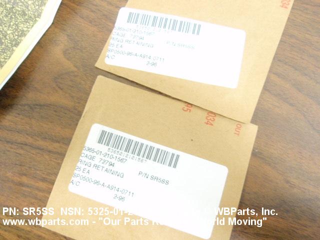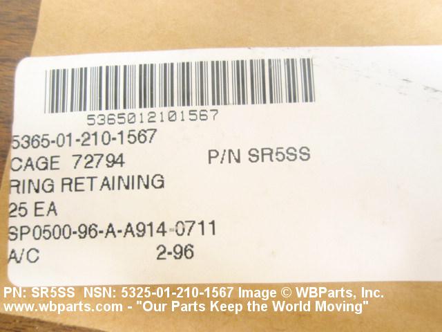 5325-01-210-1567 A resilient metal item, circular or nearly circular, which is designed to be inserted into an internal or external groove and retained by its own spring action, or it may have external prongs or projections designed to be inserted into a hole and retained by spring action of the prongs which grip by imbedding into the material. For items having internal prongs which perform the same function, see PUSH ON NUT. It is used to keep and/or lock a part(s) in position, as a ball bearing on a shaft or in a housing. See also CLIP, RETAINING and PIN, LOCK. Excludes RING, CONNECTING, ROUND.