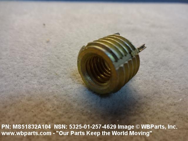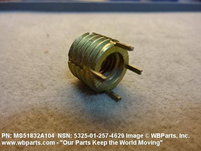5325-01-257-4629 A cylindrical item which may have wrenching and/or driving facilities and/or shoulders. It is designed to be inserted in a drilled, tapped or a pretapped hole, or molded or pressed into soft material to reduce the size of a tapped hole; to provide threads; to add strength, and/or to prevent stripping. It is one of the following: (1) a one-piece, flanged or unflanged, internally threaded item which may have external threads, and/or serrations around the periphery of the collar, designed to engage a serrated lock ring which is not included with the item; (2) a one-piece precision coiled wire; (3) a two-piece item consisting of an internally threaded cylinder and a mating externally threaded part; or (4) a one-piece internally threaded item whose outside diameter is tapered and/or knurled and/or with fin(s). The internal thread of the item may have a locking feature. Excludes items having a sleeve on on its under portion which can be clinched or crimped. Excludes BUSHING,MACHINE THREAD; NUT,PLAIN,KNURLED; NUT,PLAIN,ROUND; NUT,PLAIN,CLINCH and NUT,SELF-LOCKING,CLINCH. See also NUT,PLAIN,PLATE