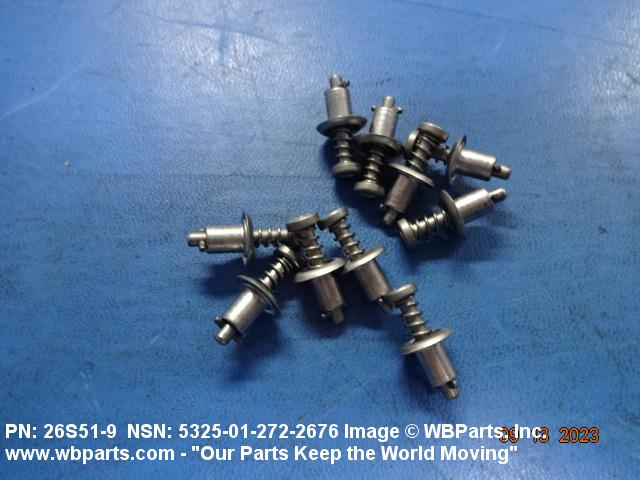 5325-01-272-2676 A STUD, TURNLOCK FASTENER over which may be assembled an EYELET, TURNLOCK FASTENER. Stud(s) without cam slots or cam lead threads are provided with a crosspin or eared nut for locking with the mating RECEPTACLE, TURNLOCK FASTENER. May be spring loaded. For like items having a threaded fastener, see SCREW ASSEMBLY, PANEL or SCREW, PANEL FASTENER.