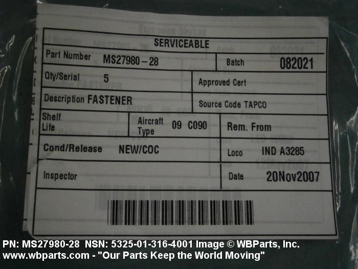 NSN 5325-01-316-4001 MS2798028, MS27980-28, 01-316-4001