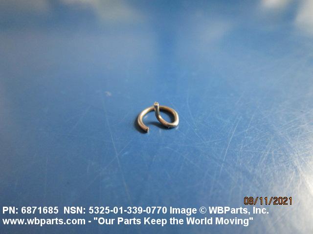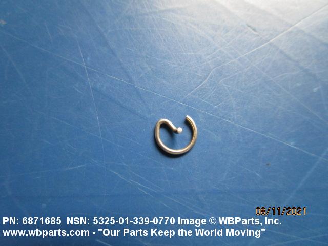 5325-01-339-0770 A resilient metal item, circular or nearly circular, which is designed to be inserted into an internal or external groove and retained by its own spring action, or it may have external prongs or projections designed to be inserted into a hole and retained by spring action of the prongs which grip by imbedding into the material. For items having internal prongs which perform the same function, see PUSH ON NUT. It is used to keep and/or lock a part(s) in position, as a ball bearing on a shaft or in a housing. See also CLIP, RETAINING and PIN, LOCK. Excludes RING, CONNECTING, ROUND.
