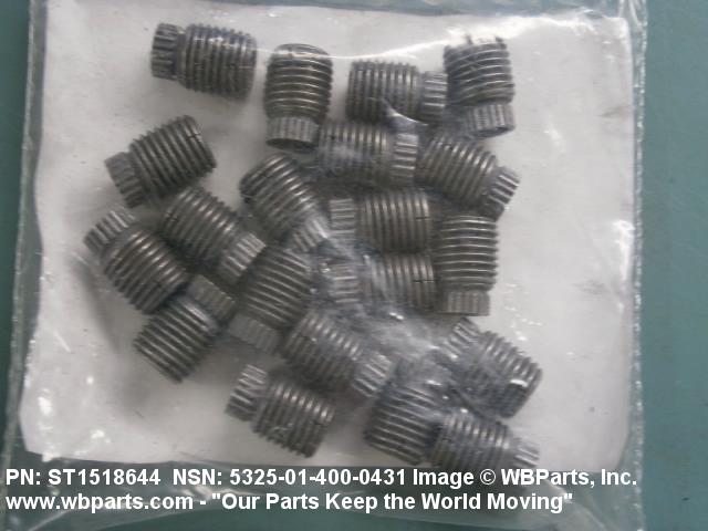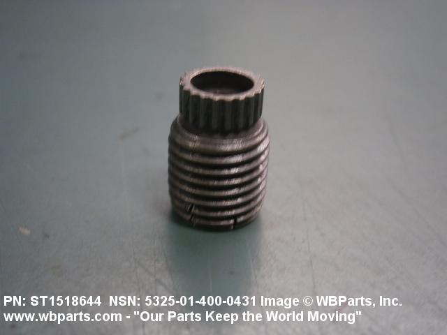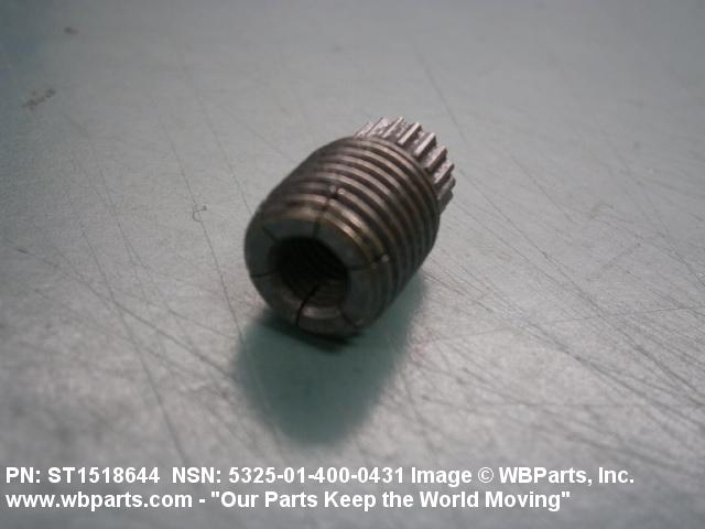 5325-01-400-0431 A cylindrical item which may have wrenching and/or driving facilities and/or shoulders. It is designed to be inserted in a drilled, tapped or a pretapped hole, or molded or pressed into soft material to reduce the size of a tapped hole; to provide threads; to add strength, and/or to prevent stripping. It is one of the following: (1) a one-piece, flanged or unflanged, internally threaded item which may have external threads, and/or serrations around the periphery of the collar, designed to engage a serrated lock ring which is not included with the item; (2) a one-piece precision coiled wire; (3) a two-piece item consisting of an internally threaded cylinder and a mating externally threaded part; or (4) a one-piece internally threaded item whose outside diameter is tapered and/or knurled and/or with fin(s). The internal thread of the item may have a locking feature. Excludes items having a sleeve on on its under portion which can be clinched or crimped. Excludes BUSHING,MACHINE THREAD; NUT,PLAIN,KNURLED; NUT,PLAIN,ROUND; NUT,PLAIN,CLINCH and NUT,SELF-LOCKING,CLINCH. See also NUT,PLAIN,PLATE