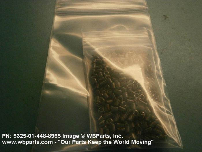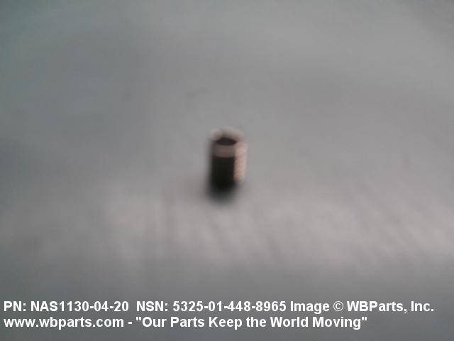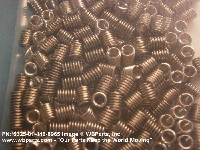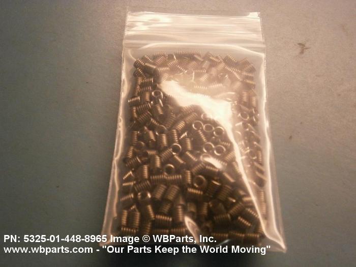 5325-01-448-8965 A cylindrical item which may have wrenching and/or driving facilities and/or shoulders. It is designed to be inserted in a drilled, tapped or a pretapped hole, or molded or pressed into soft material to reduce the size of a tapped hole; to provide threads; to add strength, and/or to prevent stripping. It is one of the following: (1) a one-piece, flanged or unflanged, internally threaded item which may have external threads, and/or serrations around the periphery of the collar, designed to engage a serrated lock ring which is not included with the item; (2) a one-piece precision coiled wire; (3) a two-piece item consisting of an internally threaded cylinder and a mating externally threaded part; or (4) a one-piece internally threaded item whose outside diameter is tapered and/or knurled and/or with fin(s). The internal thread of the item may have a locking feature. Excludes items having a sleeve on on its under portion which can be clinched or crimped. Excludes BUSHING,MACHINE THREAD; NUT,PLAIN,KNURLED; NUT,PLAIN,ROUND; NUT,PLAIN,CLINCH and NUT,SELF-LOCKING,CLINCH. See also NUT,PLAIN,PLATE