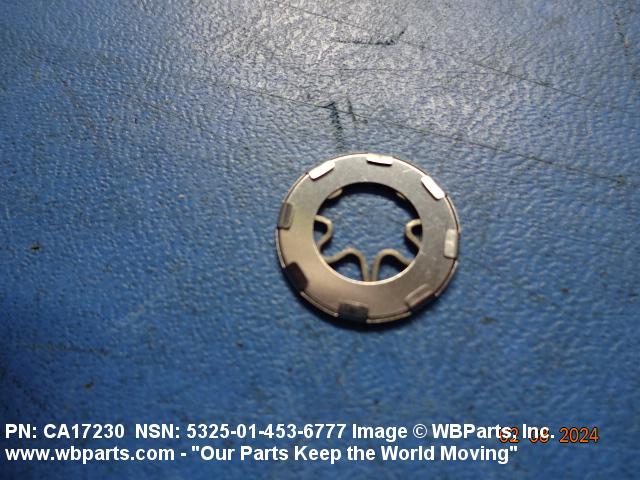 5325-01-453-6777 A resilient metal item, circular or nearly circular, which is designed to be inserted into an internal or external groove and retained by its own spring action, or it may have external prongs or projections designed to be inserted into a hole and retained by spring action of the prongs which grip by imbedding into the material. For items having internal prongs which perform the same function, see PUSH ON NUT. It is used to keep and/or lock a part(s) in position, as a ball bearing on a shaft or in a housing. See also CLIP, RETAINING and PIN, LOCK. Excludes RING, CONNECTING, ROUND.