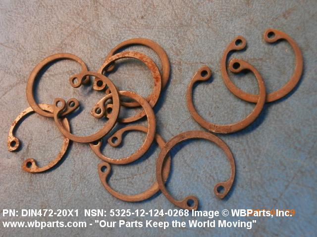 5325-12-124-0268 A resilient metal item, circular or nearly circular, which is designed to be inserted into an internal or external groove and retained by its own spring action, or it may have external prongs or projections designed to be inserted into a hole and retained by spring action of the prongs which grip by imbedding into the material. For items having internal prongs which perform the same function, see PUSH ON NUT. It is used to keep and/or lock a part(s) in position, as a ball bearing on a shaft or in a housing. See also CLIP, RETAINING and PIN, LOCK. Excludes RING, CONNECTING, ROUND.