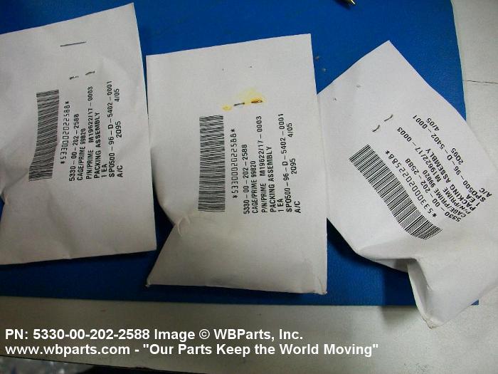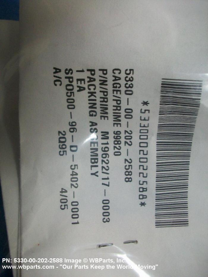 5330-00-202-2588 Any combination of items manufactured from PACKING MATERIAL to predetermined dimensions, or any combination of nonmetallic molded or formed shapes (other than solid rubber or synthetic rubber rings having a square or rectangular cross section) specifically designed and manufactured for use as a seal. The assembly may include metal lantern rings, metal separators, and/or end or adapter rings.