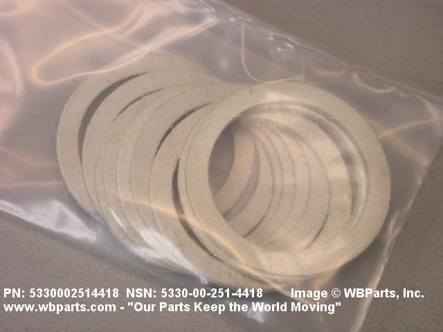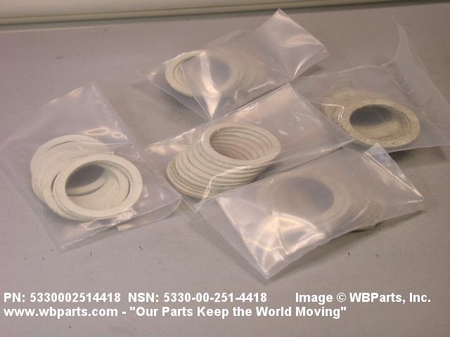 5330-00-251-4418 A deformable material which prevents the passage of matter through the joint formed when two faces are joined. It may be metallic or nonmetallic, lubricated or impregnated, solid or hollow cross section. It may be made to any predetermined dimension and shape. Excludes flat disks, items made of felt material and items having joints. For round metal and plastic items with an aperture and a solid rectangular cross section, see WASHER, FLAT; SHIM; BEARING, WASHER, THRUST; and SPACER RING. Excludes DISK, VALVE; SEAL, NONMETALLIC ANGLE; SEAL, NONMETALLIC CHANNEL; SEAL, NONMETALLIC SPECIAL SHAPED SECTION; SHIELDING GASKET, ELECTRONIC; and RING, SEALING JAR.