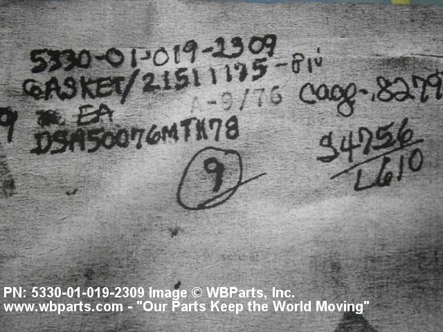 5330-01-019-2309 A deformable material which prevents the passage of matter through the joint formed when two faces are joined. It may be metallic or nonmetallic, lubricated or impregnated, solid or hollow cross section. It may be made to any predetermined dimension and shape. Excludes flat disks, items made of felt material and items having joints. For round metal and plastic items with an aperture and a solid rectangular cross section, see WASHER, FLAT; SHIM; BEARING, WASHER, THRUST; and SPACER RING. Excludes DISK, VALVE; SEAL, NONMETALLIC ANGLE; SEAL, NONMETALLIC CHANNEL; SEAL, NONMETALLIC SPECIAL SHAPED SECTION; SHIELDING GASKET, ELECTRONIC; and RING, SEALING JAR.