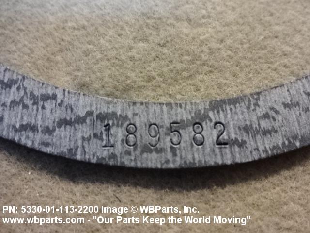 5330-01-113-2200 A deformable material which prevents the passage of matter through the joint formed when two faces are joined. It may be metallic or nonmetallic, lubricated or impregnated, solid or hollow cross section. It may be made to any predetermined dimension and shape. Excludes flat disks, items made of felt material and items having joints. For round metal and plastic items with an aperture and a solid rectangular cross section, see WASHER, FLAT; SHIM; BEARING, WASHER, THRUST; and SPACER RING. Excludes DISK, VALVE; SEAL, NONMETALLIC ANGLE; SEAL, NONMETALLIC CHANNEL; SEAL, NONMETALLIC SPECIAL SHAPED SECTION; SHIELDING GASKET, ELECTRONIC; and RING, SEALING JAR.