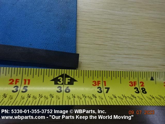 5330-01-355-3752 An elastic material of compact (solid) or cellular structure having smooth, crepe or porous surface(s) and having an oval, parallelogram, square, rectangular or D-shaped cross section. It is produced in various thicknesses. Strips are limited to widths of 6 inches (152.4mm) or less. It may or may not have a nonrubber backing or a wire cloth or cord insert. For items having a round cross section, see RUBBER ROUND SECTION. Excludes RUBBER SHEET, INNER TUBE REPAIR. See also NONMETALLIC ANGLE; NONMETALLIC CHANNEL; NONMETALLIC SPECIAL SHAPED SECTION.20253300028Packing and Gasket Materials93200027Rubber Fabricated Materials