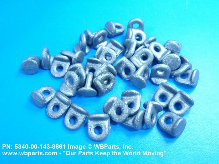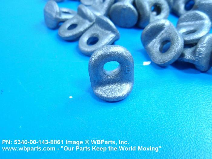 5340-00-143-8861 A rigid, metal, platelike item with an edgewise projection containing one or more openings. The opening is usually round or elliptical in shape. It is normally welded, bolted, or otherwise fixed to a structure. It is used as a catch or point of attachment for other items such as hooks, rope, and the like. Excludes, STAPLE, HASP; STRIKE, CATCH; and BRACKET, EYE, NON ROTATING SHAFT. See also ADAPTER (1), AIRCRAFT MOORING; ADAPTER (1), AIRCRAFT TOWING; TOWING EYE, AIRCRAFT; BOLT, EYE; COUPLER (as modified); and HASP, HINGED.20220400030Marine Hardware and Hull Items53400020Hardware, Commercial