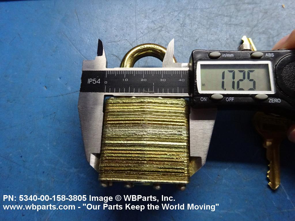 5340-00-158-3805 A detachable portable fastening device, having a shackle or bow adapted to be opened for engagement through a staple or the link of a chain. The bow or shackle, when locked, is secured in the case by means of a spring-activated pin(s) entering a notch(es) in the shackle. The lock may be opened by inserting and turning a key or keys, by key insertion only, or by a predetermined setting on the dial of a combination lock. For two or more padlocks which are keyed alike and/or master keyed, see PADLOCK SET.