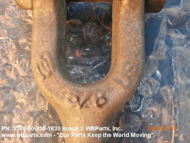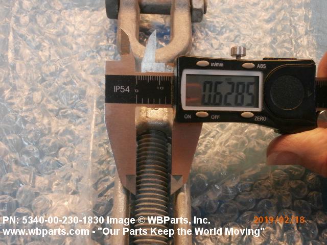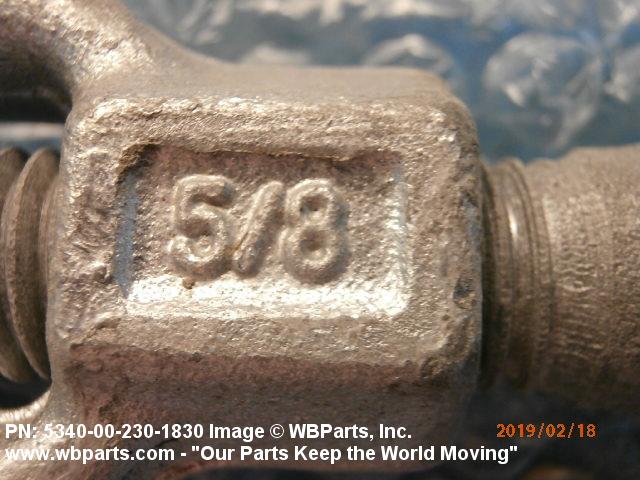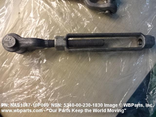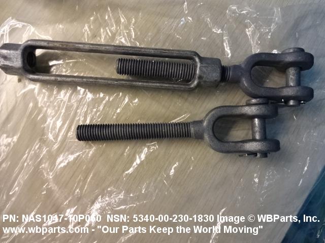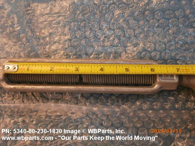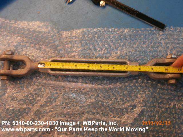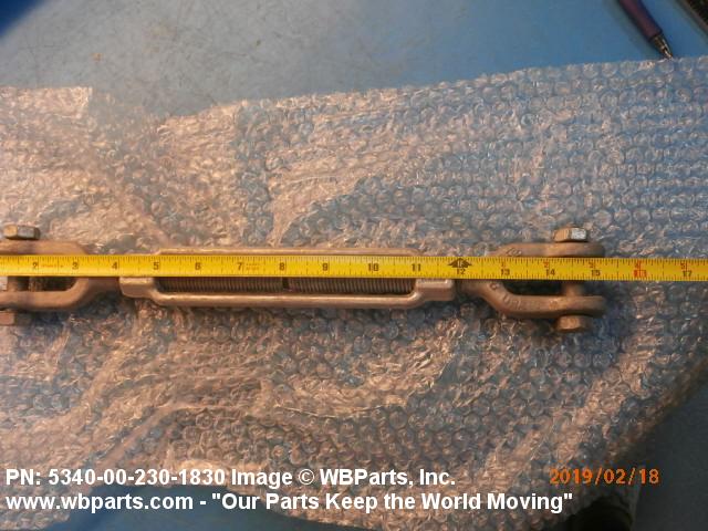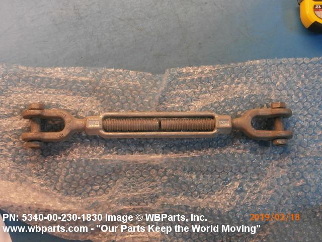5340-00-230-1830 A metal loop, sleeve, or solid body with end pulls, having both ends threaded or one end threaded and the other end designed to accommodate a swivel. Items with both ends threaded shall have right hand screw threads on one end and left hand screw threads on the other. It may include lock nuts, check nuts, jam nuts, and/or terminal attachment(s) such as hooks, rings, and the like. It is designed to regulate the distance (take-up) between two points by turning. See also PELICAN HOOK AND TURNBUCKLE ASSEMBLY; and TIE ROD, TENSIONING, THREADED END.