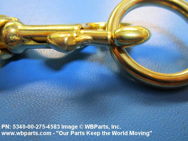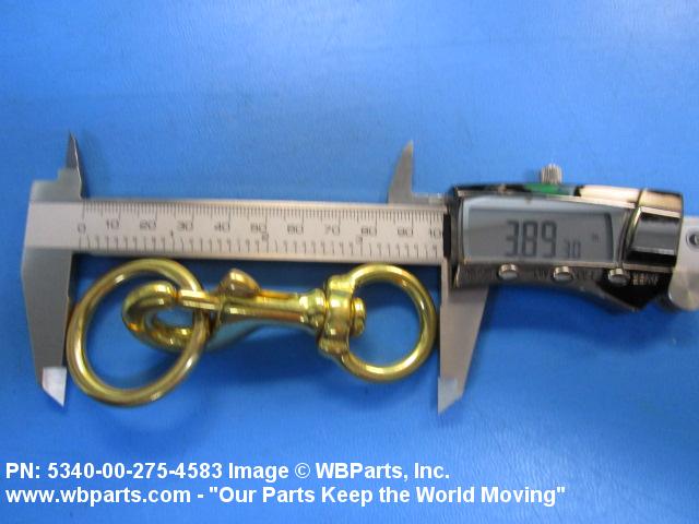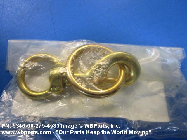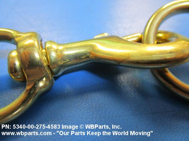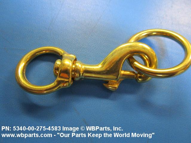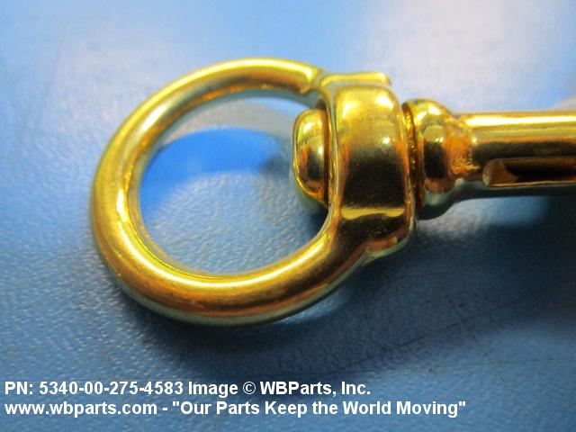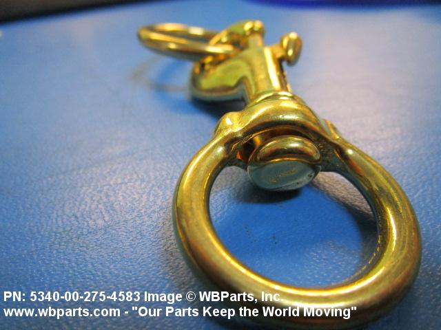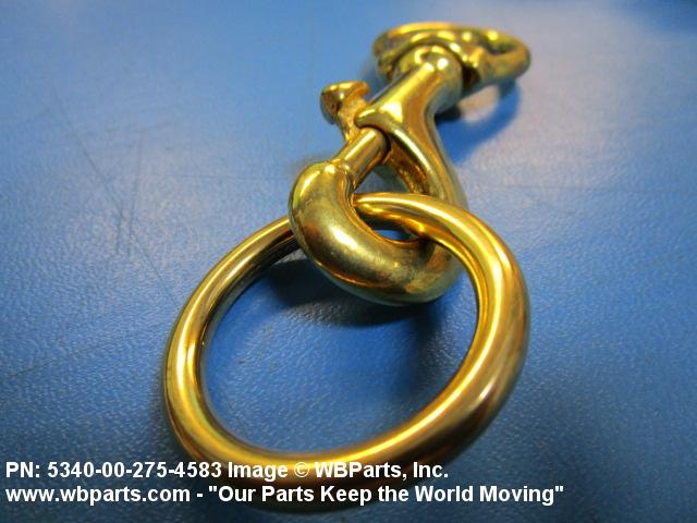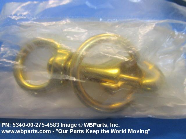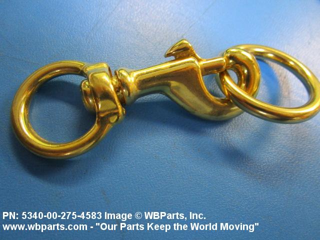 5340-00-275-4583 A metal fastening device one or both ends of which are hook shaped with a closing or locking device over the throat opening which is held closed by spring action. If hook shaped on one end only the opposite end is provided with a fixed, loose, or swivel loop or opening for connecting to another item. Excludes cargo hooks with safety devices.
