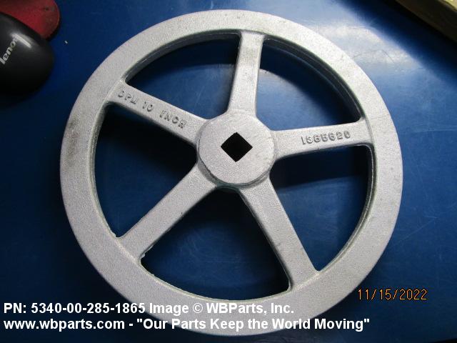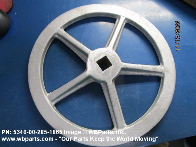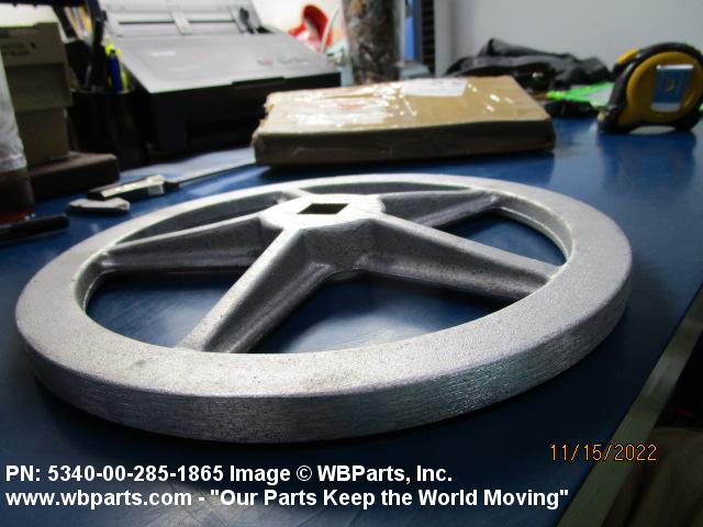 5340-00-285-1865 An item having a major diameter of 3 or more inches (76.2mm) other than items having spoked or sumulated spoked construction, which may be under 3 inches (76.2mm) designed to be gripped by the hand to transmit rotary motion to other devices through a center axis, fabricated in the form of a solid body with simulated spokes or a recessed surface between the rim and the hub, or it may be built up in the form of a frame having a central hub connected to the rim by the spokes. It may have reference markings in the form of dots, arrows, hairline, etc., to indicate the relative position and/or direction of rotation of the item(s) with which it is used. It may also include an integral ratchet device. For similar items having a maximum diameter of less than 3 inches (76.2mm), see KNOB. For items calibrated in units or series of divisions denoting relative positioning of associated devices, see DIAL (as modified). Excludes STEERING WHEEL.