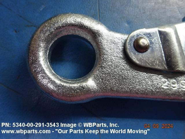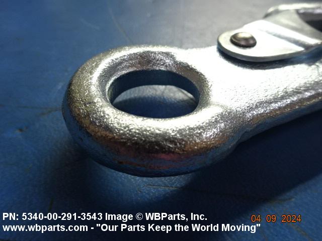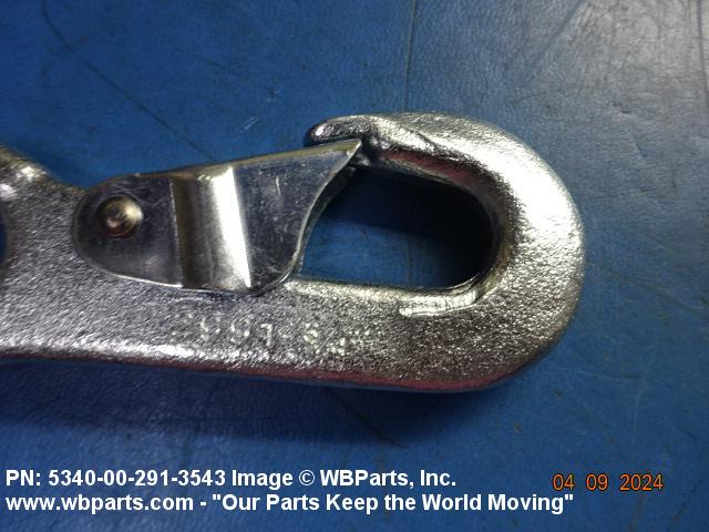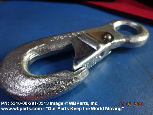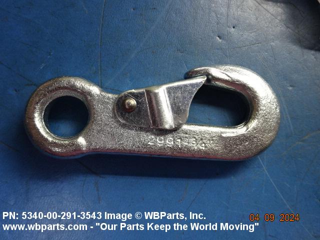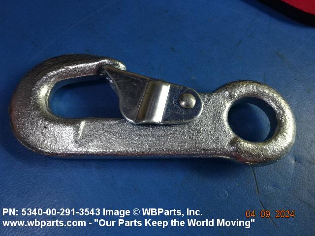 5340-00-291-3543 A metal fastening device one or both ends of which are hook shaped with a closing or locking device over the throat opening which is held closed by spring action. If hook shaped on one end only the opposite end is provided with a fixed, loose, or swivel loop or opening for connecting to another item. Excludes cargo hooks with safety devices.