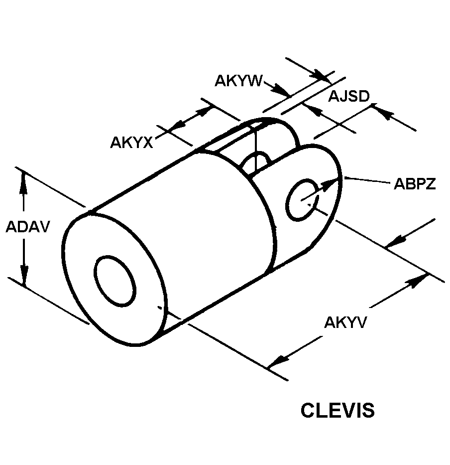 5340-00-299-0069 A forked part, having transverse hole(s) or slot(s) in each arm (prong) to accommodate a bolt, pin, or the like, and having a connection facility opposite the fork. It is designed to be attached to a shaft, rod, turnbuckle or the like by welding, threading, and/or pinning. May include provisions for locking. See also YOKE, UNIVERSAL JOINT and CONNECTOR, ROD END. For items specifically designed for aviation, see CLEVIS, ROD END, AVIATION.20210050018Guns, through 30mm53400020Hardware, Commercial