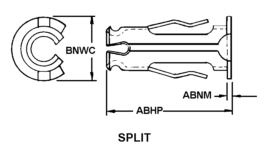 5340-00-534-0921 A tubular item of resilient metallic material, split along its entire length and having a flange at one end, usually with projecting arms or prongs extending from the body. It is designed to be inserted into a hole in a panel and held in place by spring tension. It is used to retain unthreaded items such as a pin or a rivet.