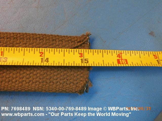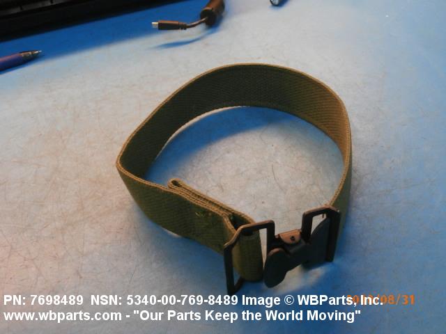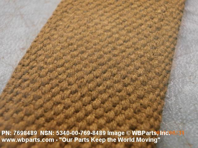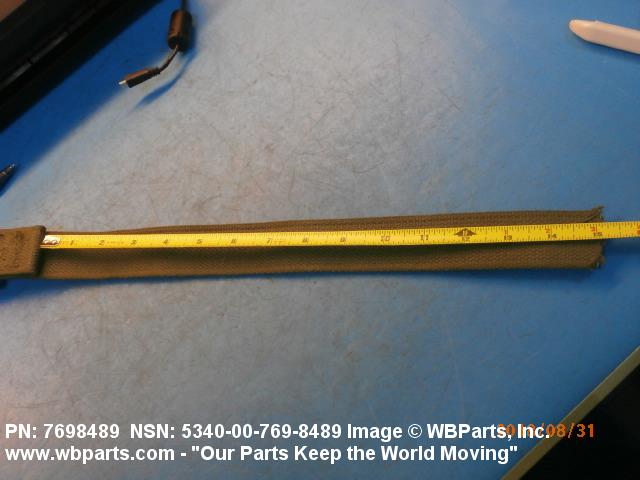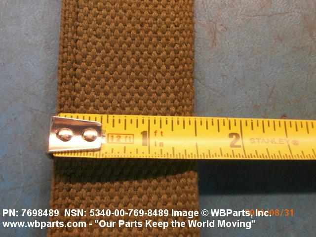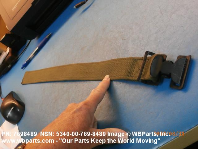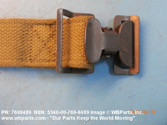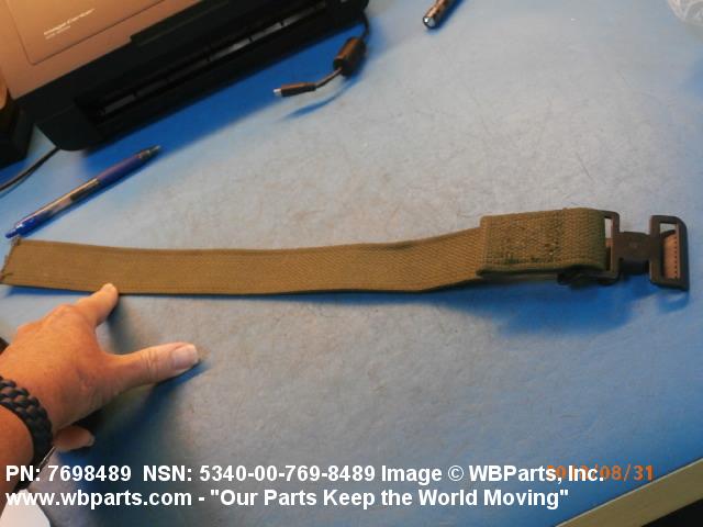 5340-00-769-8489 A narrow strip of webbing cut to a definite length, having one or both ends processed. It is usually designed for, and may have, one or more attachments or fasteners, such as BUCKLE; LOOP, STRAP FASTENER; strap end clip; RING, DEE; Hook; and the like. Excludes STRAP, BERTH, MATTRESS RETAINING; STRAP, CHIN; safety straps; and WEBBING, TEXTILE. Do not use if a more specific item name applies.20416800049Miscellaneous Aircraft Accessories and Components53400020Hardware, Commercial84650020Individual Equipment84700015Armor, Personal
