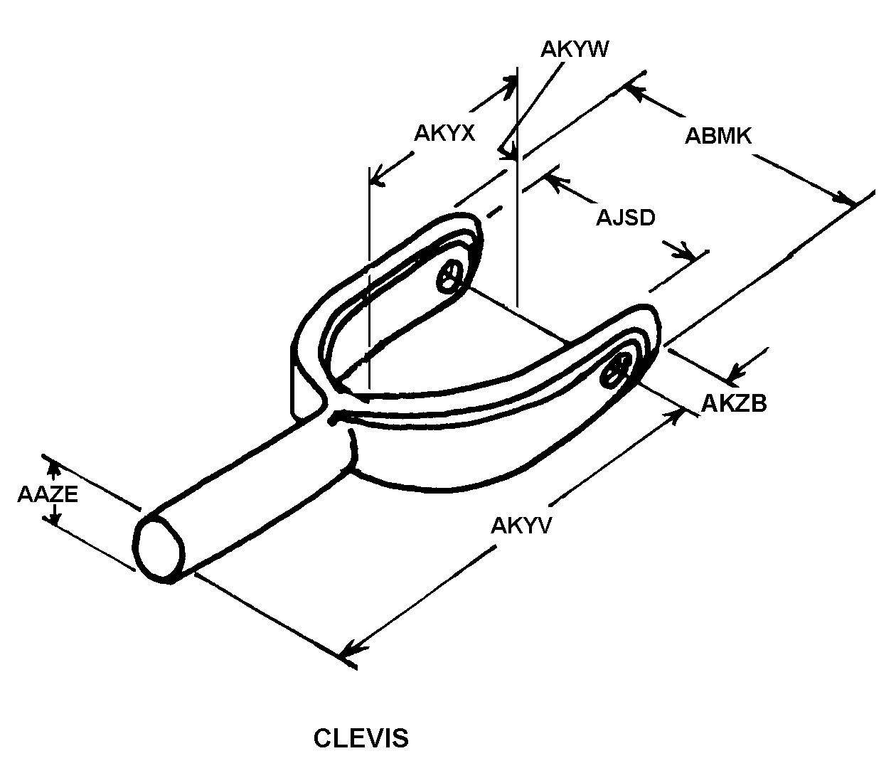 5340-00-941-0205 A forked part, having transverse hole(s) or slot(s) in each arm (prong) to accommodate a bolt, pin, or the like, and having a connection facility opposite the fork. It is designed to be attached to a shaft, rod, turnbuckle or the like by welding, threading, and/or pinning. May include provisions for locking. See also YOKE, UNIVERSAL JOINT and CONNECTOR, ROD END. For items specifically designed for aviation, see CLEVIS, ROD END, AVIATION.20210050018Guns, through 30mm53400020Hardware, Commercial