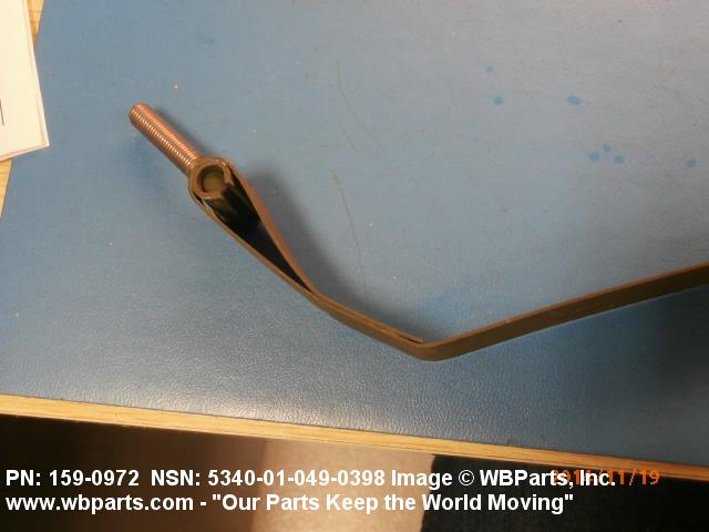 5340-01-049-0398 A flexible or semiflexible metal strip designed to partially surround and retain an item against a structure, frame, bracket, or the like. Includes a single segment of a sectioned type CLAMP, LOOP or CLAMP, HOSE. Both ends may have, but one end must have, a loop to accommodate a hinge pin, or a stud welded to the end of the band. May be furnished with a trunnion, T-bolt, pin, latch, or the like. For items designed to completely surround an object(s), see CLAMP, LOOP. See also COVER, ACCESS and STRAP, RETAINING.