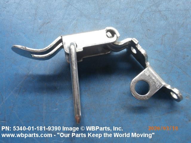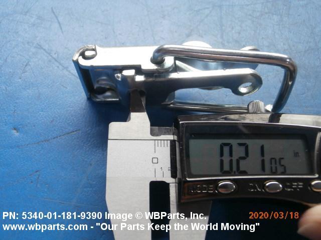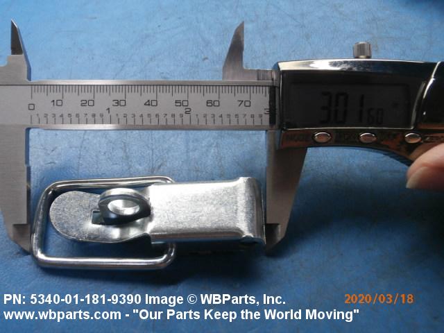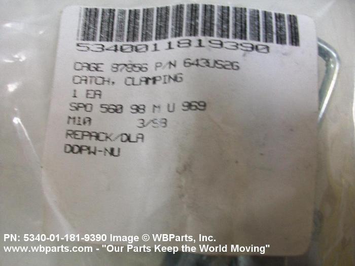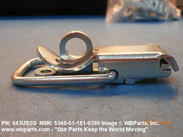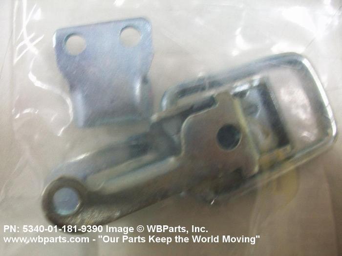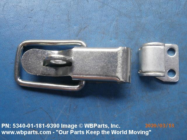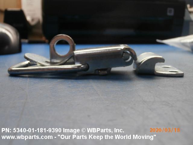 5340-01-181-9390 A positive fastening device consisting of a mountable base with an extended loop, claw, or the like. It may include a catch strike and mounting hardware for its complete installation on flat surfaces. The loop, claw, or the like can be manually engaged or disengaged readily for the purpose of securing the mating sections of a suitcase, locker-trunk, shipping and storage container, prefabricated building, tool chest or the like. Excludes CATCH, ELBOW; CATCH, FLUSH; CATCH, FRICTION; and LATCH or LOCK (as modified).