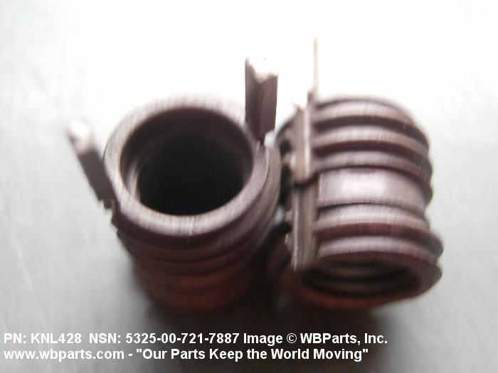 5340-01-200-7587 A cylindrical item which may have wrenching and/or driving facilities and/or shoulders. It is designed to be inserted in a drilled, tapped or a pretapped hole, or molded or pressed into soft material to reduce the size of a tapped hole; to provide threads; to add strength, and/or to prevent stripping. It is one of the following: (1) a one-piece, flanged or unflanged, internally threaded item which may have external threads, and/or serrations around the periphery of the collar, designed to engage a serrated lock ring which is not included with the item; (2) a one-piece precision coiled wire; (3) a two-piece item consisting of an internally threaded cylinder and a mating externally threaded part; or (4) a one-piece internally threaded item whose outside diameter is tapered and/or knurled and/or with fin(s). The internal thread of the item may have a locking feature. Excludes items having a sleeve on on its under portion which can be clinched or crimped. Excludes BUSHING,MACHINE THREAD; NUT,PLAIN,KNURLED; NUT,PLAIN,ROUND; NUT,PLAIN,CLINCH and NUT,SELF-LOCKING,CLINCH. See also NUT,PLAIN,PLATE