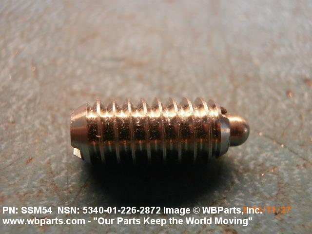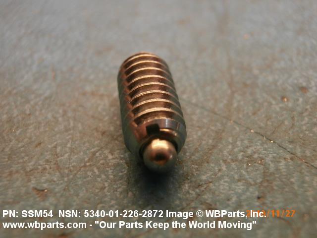 5340-01-226-2872 An externally threaded tubular item containing a spring loaded device (pin, ball, etc.). The device is held in the thrown position by the spring and recedes when pressure is exerted against it. It is used as a locator, detent, and the like.