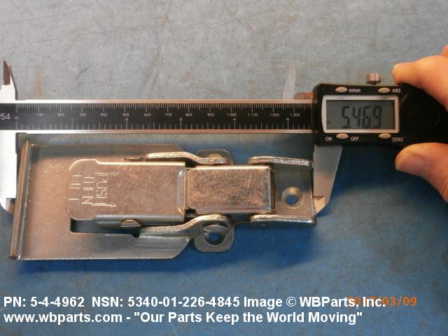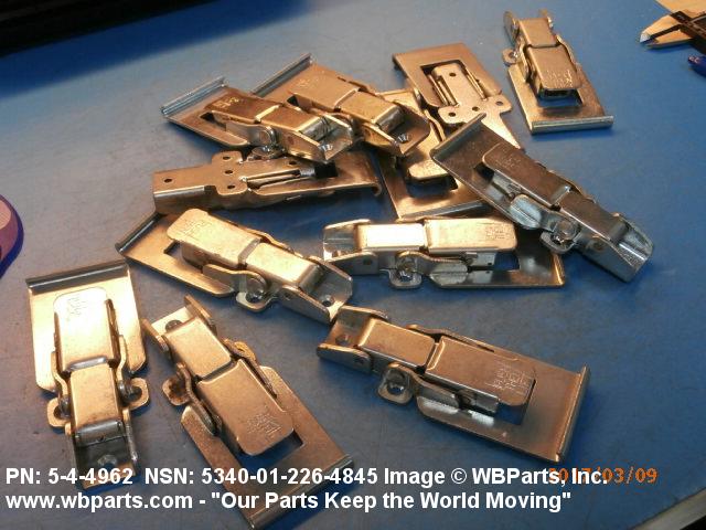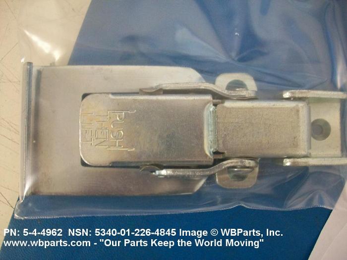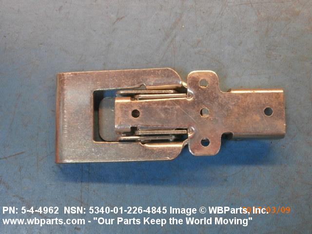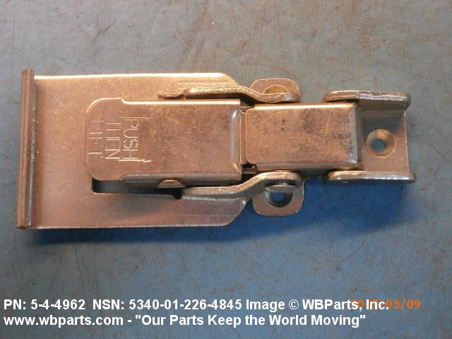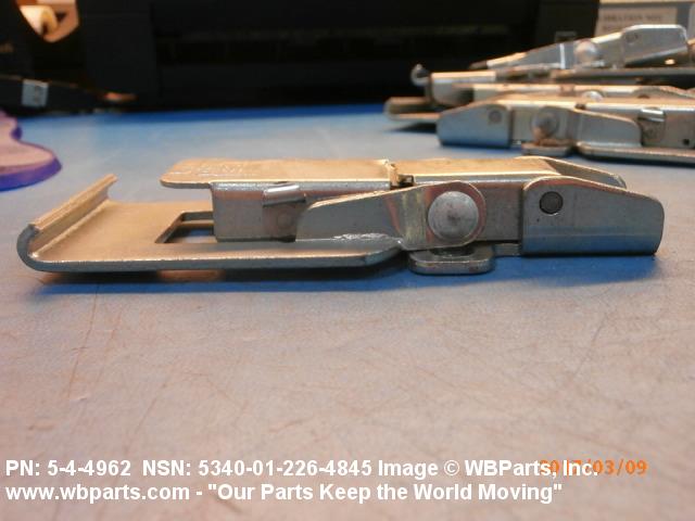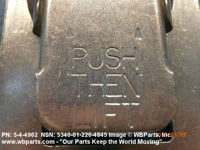 5340-01-226-4845 A positive fastening device consisting of a mountable base with an extended loop, claw, or the like. It may include a catch strike and mounting hardware for its complete installation on flat surfaces. The loop, claw, or the like can be manually engaged or disengaged readily for the purpose of securing the mating sections of a suitcase, locker-trunk, shipping and storage container, prefabricated building, tool chest or the like. Excludes CATCH, ELBOW; CATCH, FLUSH; CATCH, FRICTION; and LATCH or LOCK (as modified).
