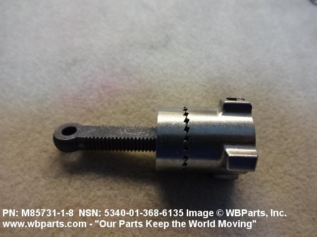 5340-01-368-6135 A threaded item having an eye on one end designed to accommodate a hinge pin, or a pin inserted at right angles to the shank. It must have an adjusting nut assembled on the threads. The end of the threads may be headed, or a cap nut or similar device attached to prevent disassembly of the adjusting nut. It may also have a washer, collar or retainer assembled between the nut and hinge mounted end. Includes items having a bracket or lug mounting. It is used to rigidly clamp items to a structure, instrument, or the like.