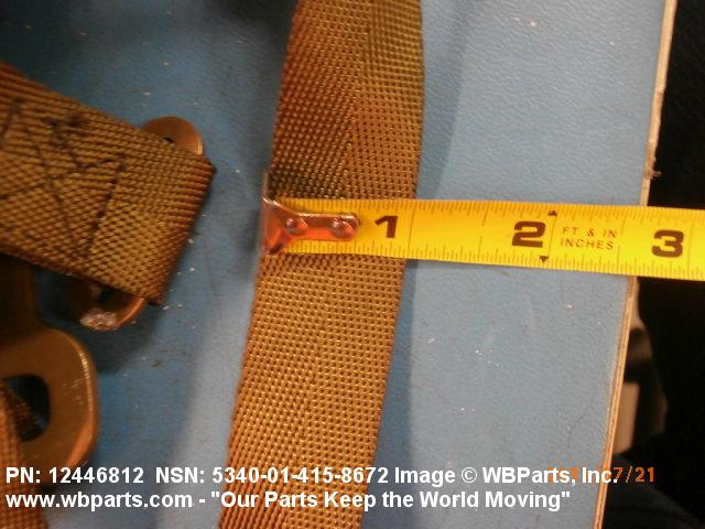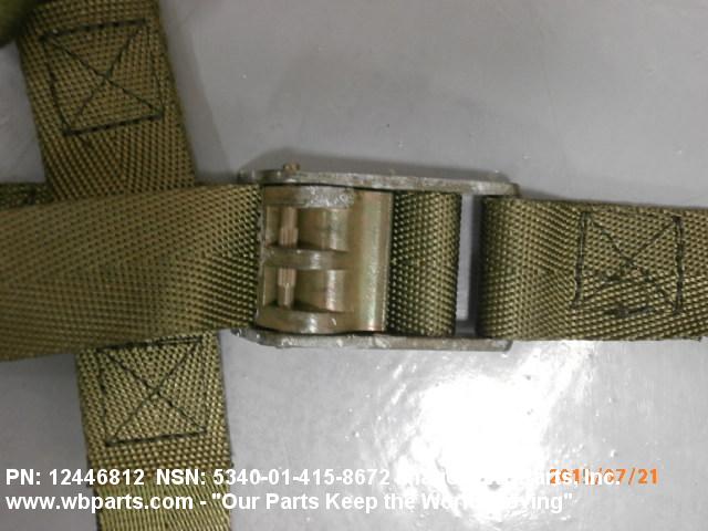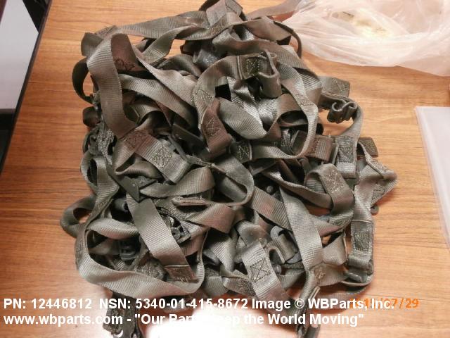 5340-01-415-8672 A narrow strip of webbing cut to a definite length, having one or both ends processed. It is usually designed for, and may have, one or more attachments or fasteners, such as BUCKLE; LOOP, STRAP FASTENER; strap end clip; RING, DEE; Hook; and the like. Excludes STRAP, BERTH, MATTRESS RETAINING; STRAP, CHIN; safety straps; and WEBBING, TEXTILE. Do not use if a more specific item name applies.20416800049Miscellaneous Aircraft Accessories and Components53400020Hardware, Commercial84650020Individual Equipment84700015Armor, Personal